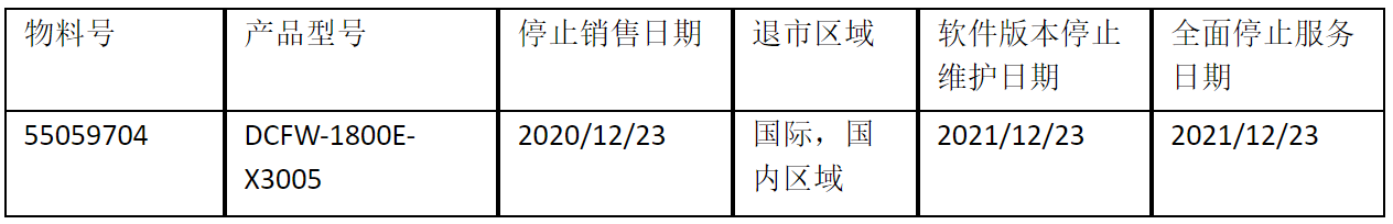 北京神州数码今年会信息技术有限公司正式通知您, 以上DCFW-1800E-X3005下一代防火墙(55059704)将于2020年12月23号停止接收新的订单(具体日期见上表),不再供货。给您带来的不便,敬请原谅。